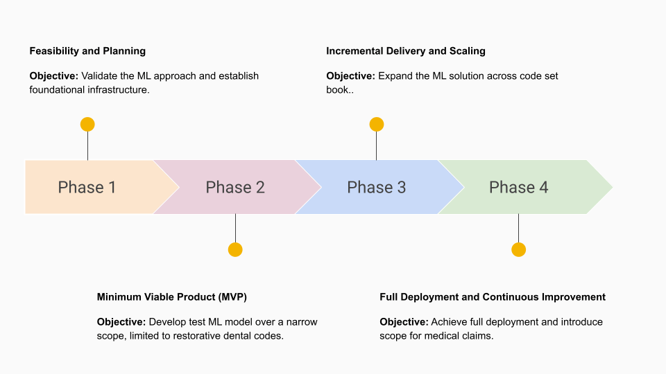| Conduct feasibility study to assess the viability of ML for procedure code identification. | Data Preparation: Standardize and organize historical X-rays and procedure code data for model training. Focus on a subset of claims (Dental Restorative procedure codes) to streamline initial development. | Enhanced Model Training: Use feedback from the MVP phase to refine the ML model. Improve accuracy. Introduce scalability and availability through cloud integration. | Full Rollout: Deploy the ML solution across all claim types and fully integrate it into the claims adjudication process. |